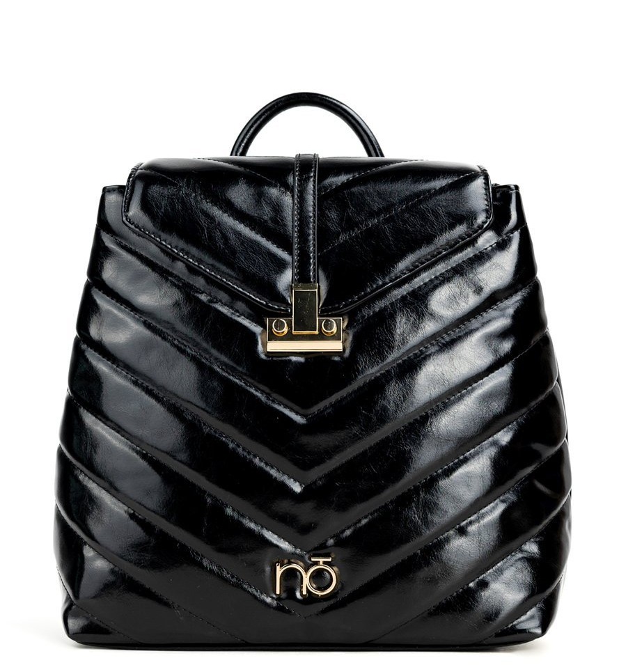 Batoh má klopnu s kovovým zapínáním. V horní části (po stranách) jsou druky, pomocí kterých lze batoh nahoře zmenšit nebo zvětšit. Uvnitř batohu je kapsa na zip a dvě otevřerné kapsy. Batoh má pevný tvar. Kovové komponenty mají zlatou barvu. Batoh je balený v ochranném pytlíku.
