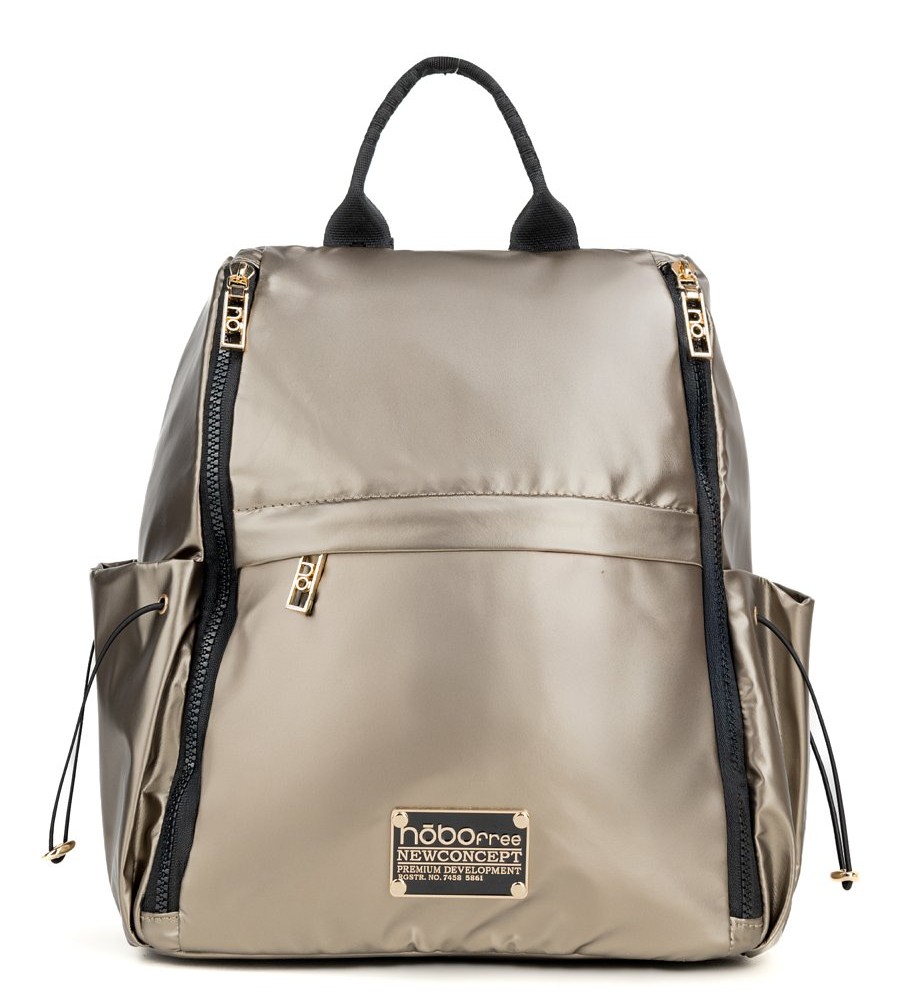 Batoh má na přední straně velkou kapsu se zapínáním na dva boční kolmé zipy, dále menší kapsu s vodorovným zipem a po stranách otevřené kapsy na stahování. Vstup do batohu je zezadu a má zapínání na zip. Uvnitř batohu je malá kapsa na zip a dvě otevřené kapsičky. Kovové komponenty mají zlatou barvu. Batoh je balený v ochranném pytlíku. Batoh je vyrobený z polyesteru (PE).
