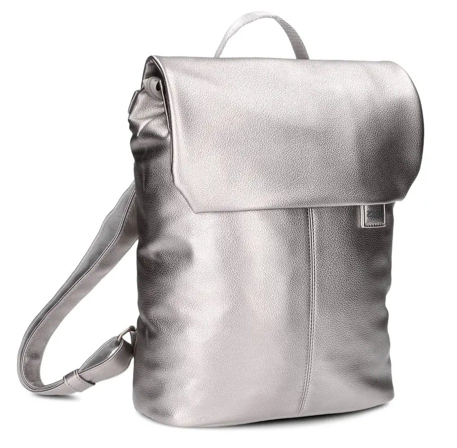 Hezký dámský batoh má jedno krátké ucho do ruky a dva nastavitelné popruhy na záda. Popruhy jsou vyrobené z pevného polyuretanu, který je pro větší pevnost ještě sešitý s textilním popruhem. Batoh má vpředu i vzadu kapsy na zip. Horní část batohu je překlopená dopředu a zapíná se na magnety skryté pod materiálem. Batoh má zapínání na zip.