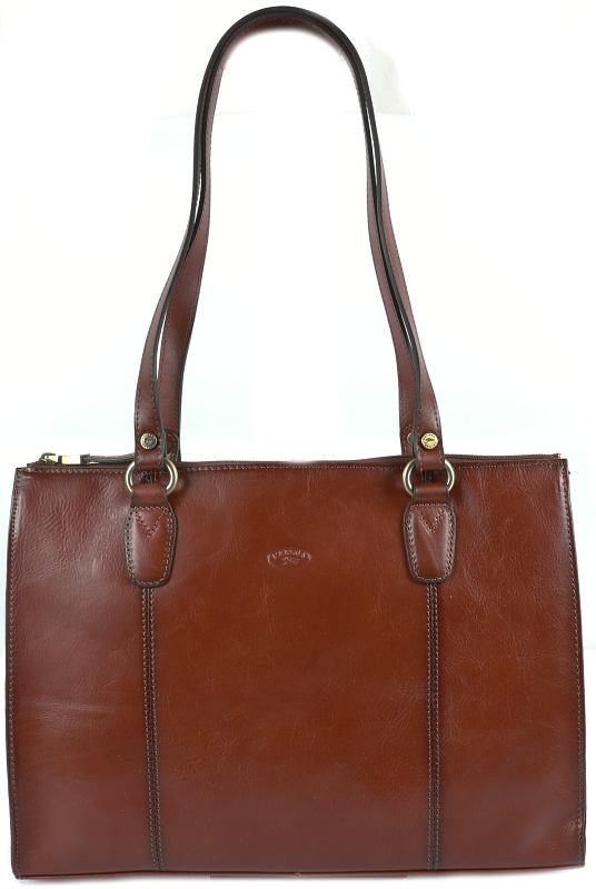 Kožená kabelka má dve dlhšie držadlá cez rameno (výška držadiel je 23 cm). Na zadnej strane je vrecko na zips. Kabelka sa zapína na zips. Vnútri kabelky sa nachádza textilná podšívka, priehradka na zips, otvorené vrecko a vrecko na zips.