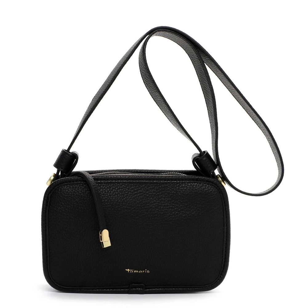Kabelka má dlouhý a nastavitelný popruh přes rameno. Kabelku tak lze nosit šikmo přes rameno jako crossbody. Na zadní straně je kapsa na zip. Kabelka má zapínání na zip. Uvnitř kabelky je pevná podšívka, kapsa na zip a otevřená kapsa. Kovové komponenty mají světle zlatou barvu. Kabelka má pevný tvar. Na přední straně je logo Tamaris.